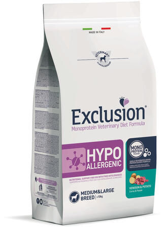 Az Exclusion Diet Hypoallergenic Venison and Potato egy teljesértékű diétás eledel felnőtt kutyák számára, melyet az összetevők és a tápanyag intollerancia csökkentésére fejlesztettek ki. Ez a komplett diétás eledel válogatott forrásból származó fehérjéket és szénhidrátokat tartalmaz. HYPOALLERGENIC: táplálási támogatás nem kívánt táplálékreakcióval küzdő k