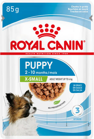 4.08kg A Royal Canin X-small Puppy egy teljesértékű nedvestáp, aprótestű kölyökkutyák részére, 10 hónapos korig. Az állaga lágy, így megfelel a kölyökkutyák tejfogainak. Olyan tápanyagokat tartalmaz mint a C- és E-vitamin, melyek bizonyítottan erősítik az immunrendszer. Omega-3 zsírsav tartalmának köszönhetően támogatja az agy fejlődését.