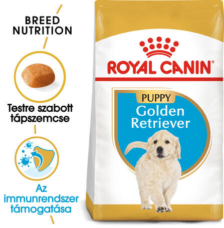 24kg A Royal Canin Golden Retriever Puppy egy teljes értékű táp golden retriever fajtájú kölyökkutyáknak, 15 hónapos korig. Egy szabadalmazott antioxidáns komplexet – benne E-vitamint – tartalmaz, hogy támogassa a kölyökkutya természetes védekező rendszerét és fenntartsa a kölyök optimális egészségét a növekedés során. EPA és DHA nevű omega-3 zsírsavakkal és bor