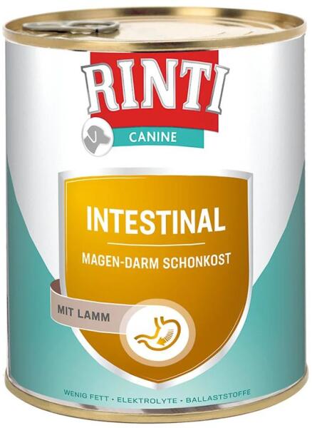 A RINTI Canine Intestinal egy teljes értékű diétás eledel emésztési problémákkal küzdő felnőtt kutyák számára. A táp a rossz emésztés és az exokrin hasnyálmirigy elégtelenség kompenzálására, valamint a bélrendszeri felszívódási zavarok enyhítésére szolgál. Alacsony zsírtartalmú, könnyen emészthető, megnövelt nátrium- és káliumtartalommal. A hozzáadott psy