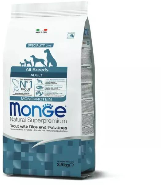 Monge Dog Speciality Line Monoprotein Adult - Trout, Rice, PotatoTeljes értékű szárazeledel felnőtt kutyák számára. Kutyája egészsége garantált a kiváló minőségű alapanyagoknak és az olasz szakértői kutatásnak köszönhetően. Kizárólag egyféle állati eredetű fehérjét tartalmaz. Fő összetevője a pisztráng, ami könnyen emészthető és a hozzáadott friss húsnak k
