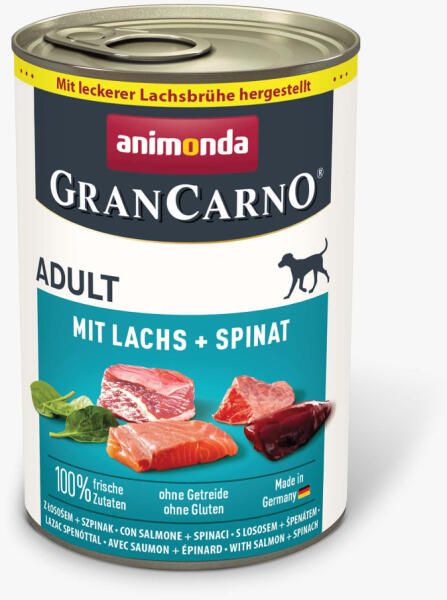 GranCarno® Adult lazaccal és spenóttal – a tökéletes választás felnőtt kutyája kiegyensúlyozott, ízletes és egészséges étrendjéhez! Ez a prémium kutyaeledel kifejezetten 1-6 éves kutyák számára lett kifejlesztve, és kielégíti szőrös barátja minden fontos táplálkozási szükségletét. A GranCarno® Adult lazaccal és spenóttal gondosan válogatott, friss alapanyagok