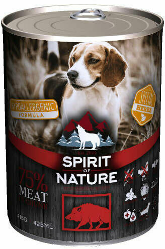 Hypoallergenic Vaddisznó SzószbanSpirit of Nature Vaddisznó répával szószban. Teljesértékű hipoallergén nedves eledel, szarvas és vaddisznóhús darabok szószban répával felnőtt kutyák részére. Válogatott alapanyagokból, magas hústartalommal, baromfihús és gabona felhasználása nélkül készült hipoallergén formula! A Spirit of Nature termékek nem tartalmaznak szóját,