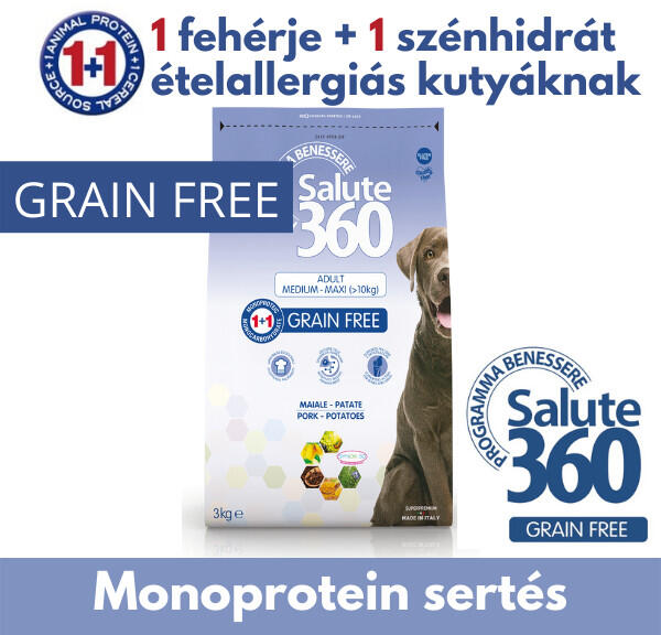 SALUTE360 Adult M-L Pork Hipoallergén Grain Free Kutyatáp 12kg · CSONTOK ÉS ÍZÜLETEK TÁMOGATÁSA: a glükózamin és a kondroitin-szulfát együttes hatása · KERINGÉSI RENDSZER TÁMOGATÁSA: halolaj, ami természetes omega-3 forrás koleszterin-ellenes hatással · A BŐR ÉS SZŐRZET SZÉPSÉGE: halolaj, ami természetes omega-3, A-vitamin, biotin, cink és omega-6 forrás · PREBIOTIKU