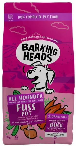 A Barking Heads All Hounder Fuss Pot Pot Duck gabonamentes, magas kacsahús tartalmú eledel felnőtt kutyák számára. Gabonamentes eledel 50% kacsahússal. Az alacsony szénhidráttartalmat az édesburgonya, a borsó és a sárgarépa biztosítja. Az eledel ideális érzékeny emésztésű felnőtt kutyáknak vagy gabonaallergiában szenvedő egyedeknek. Nem tartalmaz mesterséges színezéket,