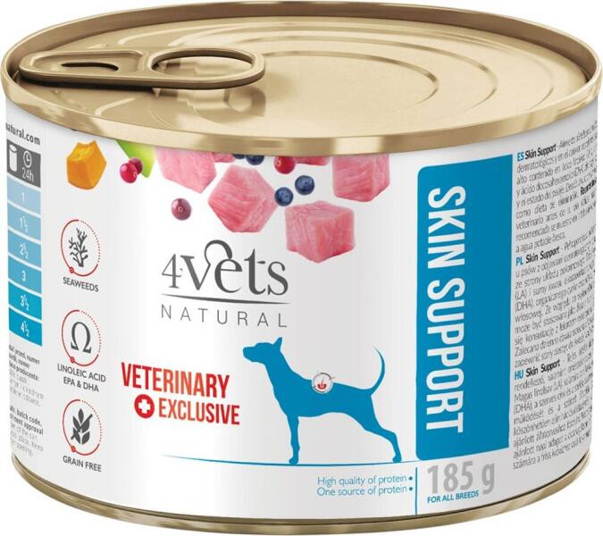 Gabonamentes Tel ítetlen zsírsavakat tartalmaz A modern állateledel-ajánlásoknak megfelelően kifejlesztve A 4vets Skin Support állatorvosi táp bőrgyógyászati tünetek és emésztőrendszeri mellékhatások esetén ajánlott teljes értékű kutyatáp. Omega-3 és -6 zsírsav, szerves cink és szelén tartalmának köszönhetően támogatja a bőr működését és a szőrzet állapotát