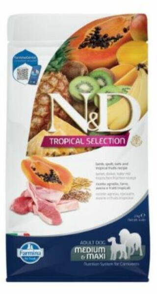 A N&D Tropical Selection Dog Lamb Adult Medium&Maxi egy ínycsiklandó szárazeledel trópusi gyümölcsökkel és sertéssel. Kifejezetten nagy és közepes testméretű felnőtt kutyusok számára kifejlesztett táp. Csirkehúsmentes recept. Különleges bárányhúsos száraztáp trópusi gyümölcsökkel és ősi gabonafélékkel. - A bárányhús különö sen jó minőségű fehérj