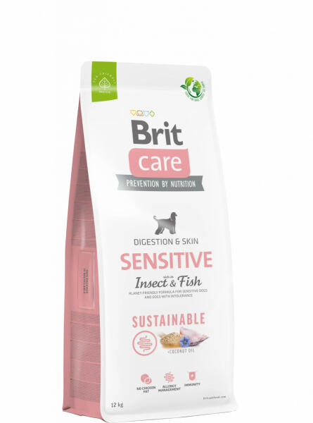 Brit Care Dog Sustainable Sensitive. Fenntartható alapanyagokból készült, rovarokban és halhúsban gazdag gabonamentes recept intoleranciában szenvedő érzékeny kutyák számára. Teljes értékű kutyatáp. Összetevők: dehidratált rovarok (14 %), dehidratált fehér húsú hal (14 %), sárgaborsó (14 %), zöldborsó (14 %), szárított almapép, borsófehérje, kókuszolaj (8 %), hidr