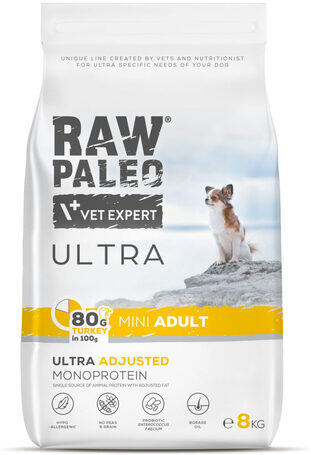 8kg Raw Paleo Ultra Adult Mini Turkey teljes értékű és tökéletesen kiegyensúlyozott eledel mini méretű (8 kilogram alatti) felnőtt kutyák számára 1-7 éves életkorig. Ez a gabonamentes eledel egyben mono-fehérje formulán alapszik, így az állati eredetű összetevők egyetlen fehérjeforrásból, szabadtartású pulykából származnak (80%), amelynek nagy része friss pulykahús.