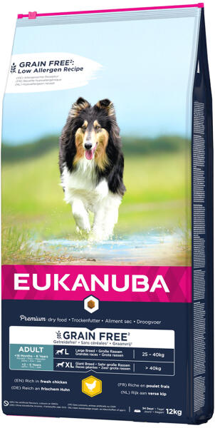 Gyártó: EUKANUBA Modell: Adult Large Grain Free Chicken 12 kg Leírás: Az EUKANUBA Grain Free felnőtt, nagy és óriás fajtájú kutyák számára készült eledel. Antioxidánsokat és vitaminokat tartalmaz a megfelelő immunműködés érdekében, valamint gluténmentes jamgyökeret, mint természetes rost- és ásványi anyagforrást. Répapépet és FOS prebiotikumokat adtunk hozzá, hogy
