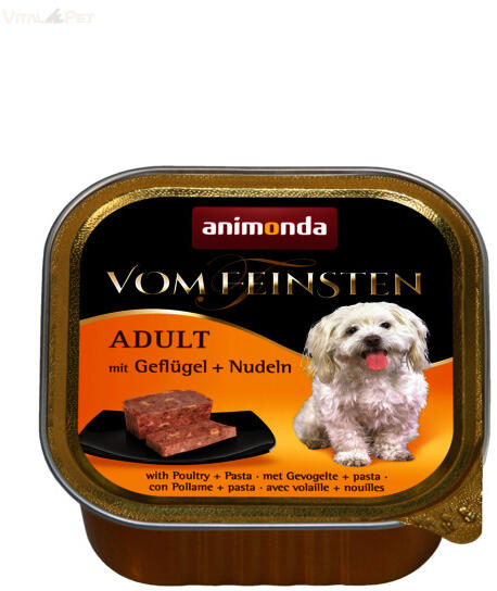Teljes értékű eledel növekedésben levő kutyáknak az 5. héttől, gabona és szója nélkül, kiváló minőségű húsok magas részarányban, táplálékérzékeny kiskutyáknak is, mesterséges adalékanyagok nélkül. Az Animonda Vom Feinsten Junior illeszkedik a kölykök és fiatal kutyusok táplálkozási igényeihez. Az összetétel tiszta, húsos alapanyagokból áll, gabona, szója