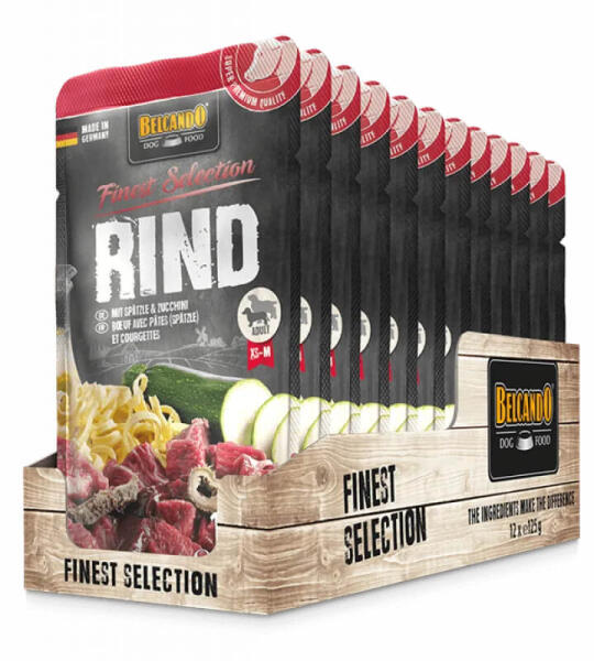 Marhahús nokedlivel és cukkínivel 125g BELCANDO® FINEST SELECTION kutyaeledelKiváló receptúrák egy etetési méretben csomagolva. Szaftos, finom hozzávalókkal ízesített, kíméletesen főzött hús, tasakba kiporciózva. A hidegen sajtolt bogáncsolaj létfontosságú telítetlen zsírsavakat ad hozzá. A BELCANDO® FINEST SELECTION rendkívüli ízletességének és hasznosíthatós