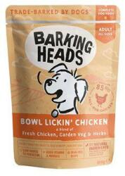 BARKING HEADS Bowl Lickin' Chicken kapszula 300g, Složení: 85 % kuře (60% kuřecí maso, 25% kuřecí vývar), hrášek, batáty, mrkev, cuketa, slunečnicový olej, olej z lososa, mořské řasy, vojtěška, petržel, celer, kořen čekanky, kopřiva, kurkuma, anýz, minerály Analytické složky (%): proteiny 9%, tuky 7%, vláknina 1,5%, hrubý popel 2%, vlhkost 79% Nutriční doplňkové lá