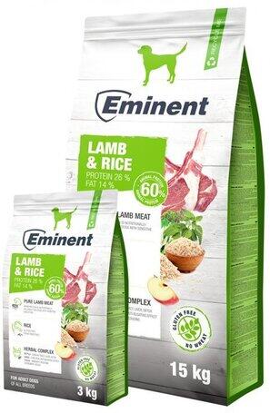 30kg Eminent Lamb & Rice (26/14) teljes értékű kutyatáp felnőtt kutyáknak. 4 hónapos kortól minden kutyafajtának. Érzékeny emesztésű, élelmiszer allergiával és bőrproblémákkal küzdő kutyáknak, bárányhúsból és rizsből. Az FMP rendszer a yucca kivonattal együtt jótékonyan befolyásolja az emésztőrendszer helyes működését, a béta-glükánokkal közösen erős