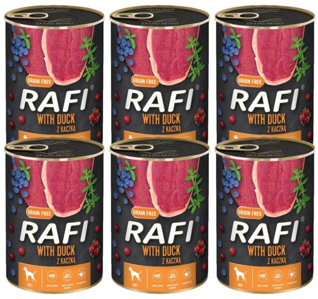 Dolina Noteci Rafi kacsával 800g - Leírás Teljes értékű nedves eledel minden fajta felnőtt kutyának kacsával. Ez a Rafi nedves eledel a kacsából származó hús és állati eredetű nyersanyagok felhasználásának köszönhetően teljes értékű fehérjeforrás, amely tartalmazza az összes esszenciális aminosavat. A kacsaeledel megfelelő arányban tartalmaz szelént, rezet és vasa
