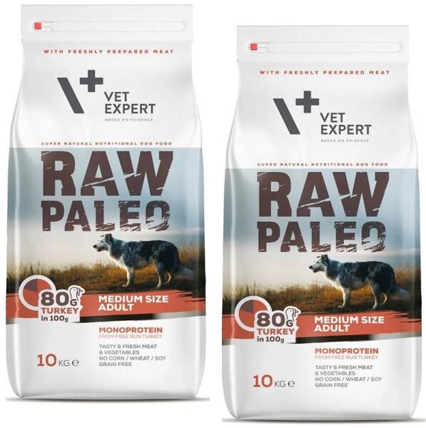 VETEXPERT Raw Paleo Adult Medium 10kg - Termékleírás Teljes értékű, teljes értékű és kiegyensúlyozott eledel felnőtt, közepes fajtájú kutyák számára 1 éves kortól. A 100 grammonként 80 g pulyka könnyen emészthető fehérje- és energiaforrást biztosít, amelyre minden kutyának szüksége van. A friss hús nagy aránya garantálja a magas ízletességet. Összetétel Pulyka
