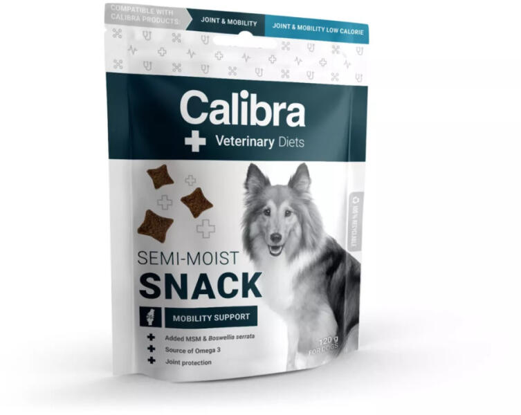 Calibra Veterinary Diets Mobility Support Semi-moist Snacks 120g Kiegészítő kutyaeledel. Félnedves, funkcionális falatok felnőtt, mozgásszervi problémákkal küzdő kutyáknak. Csak a megfelelően kialakított étrend járulhat hozzá az osteoarthritis megoldásához. Összetétel: heringfehérje (26 %), borsó, növényi eredetű glicerol, friss hering (14 %), hidrolizált csirkefehérje
