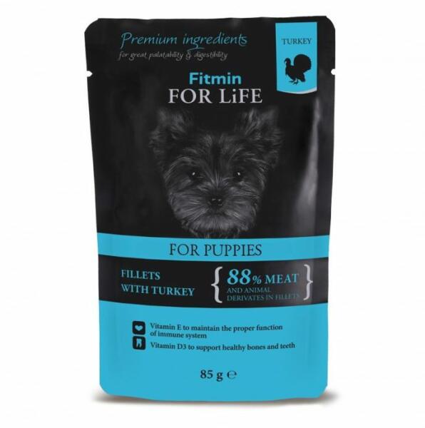 A Fitmin For Life pulyka hústasak mártásban 88% húst tartalmaz. cink a fényes szőrzetért E-vitamin az immunrendszer megfelelő működésének fenntartásához D3-vitamin az egészséges csontok és fogak támogatására öss zetevők: Hús és állati eredetű termékek (88% filében, ebből 40,6% csirke, 4% sonka), növényi eredetű melléktermékek (0,4% inulin), olajok és zsírok, ás