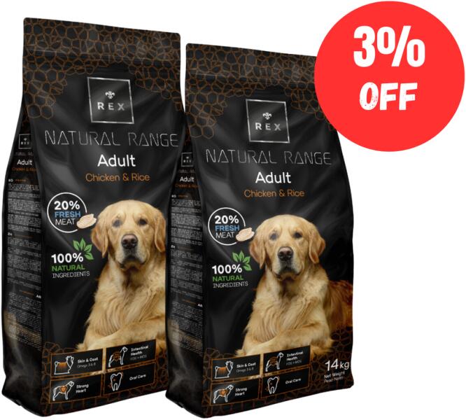 Rex Natural Range felnőtt csirke és rizs 14kg Teljes értékű eledel felnőtt, közepes fajtájú kutyáknak 12/18 hónapos kortól. Erős szívvel A megfelelő mennyiségű taurin segíti a szívritmus serkentését és táplálja a szívsejteket is. Az Omega 6 zsírsavak segítenek a szív- és érrendszer egészségének védelmében. Bélrendszeri egészség (FOS+MOS) Prebiotikus hatás, el