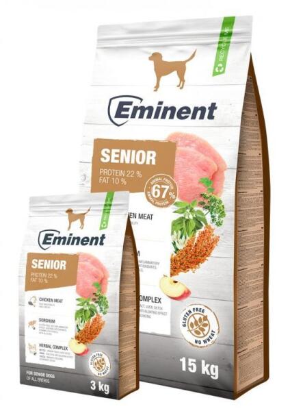 Az Eminent Senior ideális idősebb és túlsúlyra hajlamos kutyák számára. A csökkentett fehérje (22%) és zsír (10%), valamint a rizs nagyobb aránya miatt könnyebben emészthető. A konjugált linolsav (CLA) és az L-karnitin segít a kutya testsúlyának optimalizálásában, valamint cukorbetegség és rákmegelőzőként hat prebiotikumok FOS (fruktooligoszacharidok) és MOS (mannán