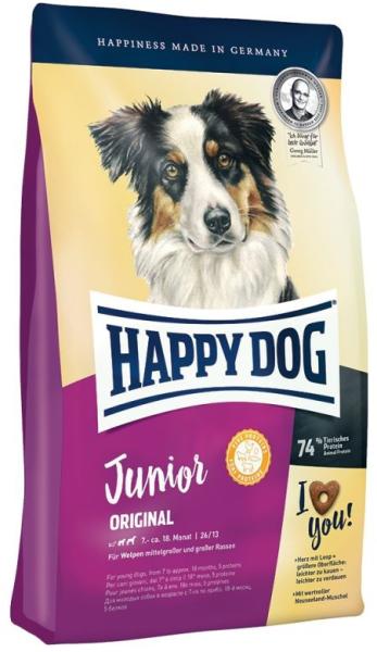 Happy Dog Junior Original száraz táp, 74% fehérje tartalommal. 7 hónapos kortól, az eledelnek csökkentett energia- és fehérjetartalommal kell rendelkeznie, hogy elkerülhető legyen a túl gyors növekedés. A Happy Dog Junior Original gluténmentes eledel ideális energia-, illetve fehérjetartalommal rendelkezik fiatal kutyák számára. A jól bevált recept 5 különböző prémium min