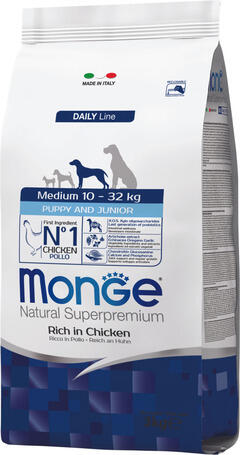 3kg Monge Daily Line Dog Medium Puppy & Junior (29/18) teljes értékű állateledel közepes méretű (10-32 kg) kölyök és növendék kutyáknak. A kiváló minőségű alapanyagoknak és az olasz gyártó több évtizedre visszanyúló kutatómunkájának köszönhetően egészséges táplálkozást biztosít kutyájának. Xylo-oligoszacharideket és probiotikumokat tartalmaz, amik támog