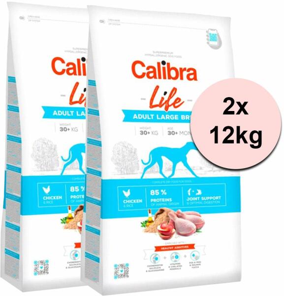 Calibra Life hipoallergén, teljes értékű, szuper prémium szárazeledel felnőtt (30 hónapos kortól), nagytestű (30 kg-tól) kutyák számára, csirkehússal és rizzsel készült. akár 85% állati eredetű fehérjét tartalmaz a hozzáadott kondroprotektív anyagok megóvják az ízületi porcok egészségét és a vitaminokkal, valamint ásványi anyagokkal együtt hozzájárulnak a kuty