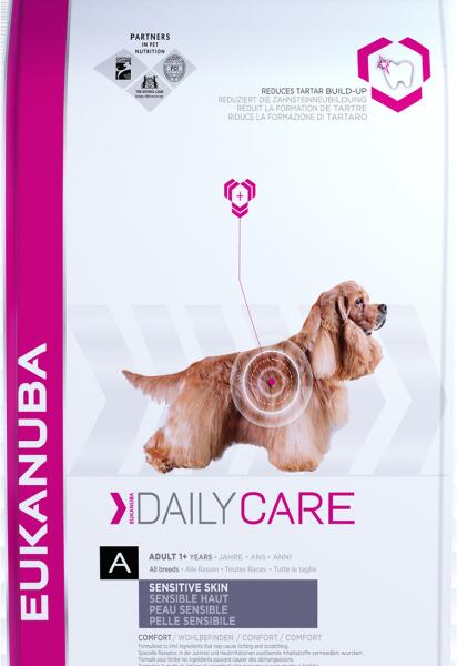 Eukanuba Daily Care Sensitive Skin: A bőr és szőrproblémákkal küzdő kutyák állapotának javítására. Minden fajta érzékeny emésztésű kutyának 1 éves kortól. A bőrirritáció elkerüléséért: - Hal és tojás, mint kizárólagos fehérjeforrások. - Kukorica, mint egyedüli szénhidrát-forrás. Az erős és egészséges immunrendszerért: - Védi az immunrendszert, és erős