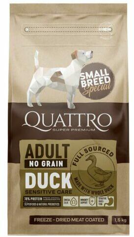 A QUATTRO SMALL BREED száraz eledelek gabona (pl. : búza, szója, árpa és más esetlegesen allergiát okozó gabonák) felhasználása nélkül készülnek! A QUATTRO SMALL BREED termékek rostban gazdag burgonyával és cukorrépa péppel egészülnek ki, így válnak mindennapos gabonamentes táplálékká az érzékeny gyomrú kistestű kutyafajták számára. A termékpaletta a SENSITIVE C
