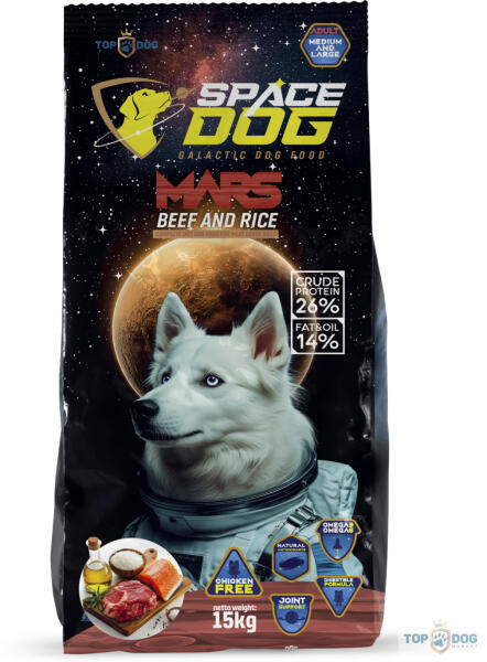 Space Dog Mars Marha és Rizs 15 kg Teljesértékű eledel felnőtt kutyák részére Szemcseméret: Medium&Large - Csirkementes - A száraztáp csirkehúsmentes receptúra alapján készült, így ideális csirkeallergiás kedvenceknek. - Omega-3 és Omega-6 - Zsírsavak kulcsfontosságú tápanyagok a kutyák egészségének megőrzésében. - Természetes antioxidáns - Erősítik az immunr
