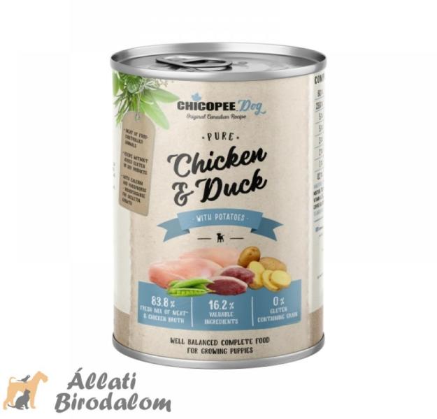 Chicopee Konzerv Junior Dog Csirke, Kacsa és Burgonya 400g A Chicopee Junior Dog konzerv eledel egy teljes értékű, gabona- és burgonyamentes étkezési lehetőség kölyökkutyák számára, csirkehússal, kacsával és burgonyával. Ez a tápláló eledel segít a kiskutyák egészséges fejlődésében és megfelelő tápanyagellátottságot biztosít számukra. Összetétel: 60% hús és