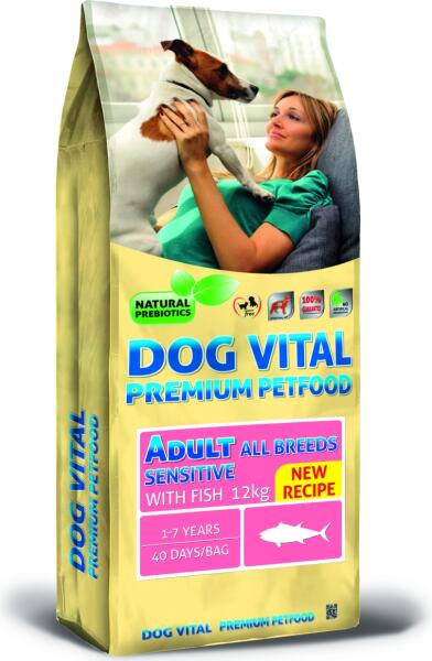 24kg A Dog Vital Adult All Breed Sensitive Fish egy teljes értékű kiegyensúlyozott eledel az érzékeny emésztésű és válogatós felnőtt kutyák részére. Halat és rizst tartalmaz, mely összetevők a kifejezetten érzékeny emésztésű kutyák etetésére alkalmasak. Az egyedi halas alapanyagnak köszönhetően a halhúsban lévő omega-3 és omega-6 zsírsavak hozzájárulnak a kutya
