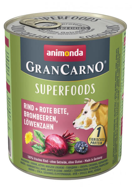 Egy eledel, amelyben ott rejtőzik minden, amire kutyája jó közérzetéhez szükséges. Az Animonda GranCarno Adult Superfoods ellátja kedvencét minden létfontosságú tápanyaggal, s még némi extrával is: a sok friss hús mellett különféle superfood-ok is gazdagítják ezt a nedvestápot, melyek plusz vitálanyagot szállítanak az állat számára. Az Animonda GranCarno Adult Superfo