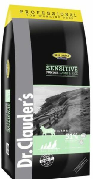 Dr Clauders SensitiveJunior Lamb amp Rice teljes értékű száraz eledel érzékeny gyomrú kölyökkutyák részére bárányhússal és rizzsel 8 hetes kortól adhatóPrebiotikus rost tartalommal FOS miatt jól emészthetőMannán-oligoszacharidok MOS fruktooligoszacharidok FOS és élesztő béta-glükánok komplexét tartalmazzaPozitív hatással lehet a fiatal kutya érzékeny bélflórájá