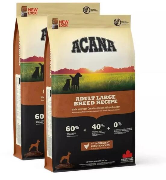 Acana Adult Large száraz kutyatáp Az Acana Adult Large száraz kutyatáp kifejezetten nagy testű kutyáknak készült, akiknek szükségük van a megfelelő mennyiségű és minőségű fehérjére. A táp friss és nyers állati alapanyagokat tartalmaz, amelyek hasonlítanak a kutya őseinek táplálékához. A WholePrey szupertáplálék nagy arányban tartalmaz baromfit, halat, belsőségeke