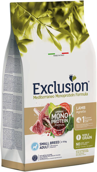Teljes értékű bárányhúsos eledel egyetlen állati fehérjeforrással kistestű felnőtt kutyák részére. A Mediterranean Exclusion Monoprotein Formula – Noble Grain egy teljes értékű és kiegyensúlyozott, egyetlen állati fehérjeforrás felhasználásával készített termékcsalád. Kizárólag dehidratált csirke, marha, juh vagy tonhal felhasználásával, egy egyszerű, letisztu