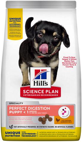 A közepes testű kölyökkutyák számára kifejlesztett, csirkés és barna rizses Hill's Science Plan PERFECT DIGESTION MEDIUM PUPPY kutyaeledel teljes értékű állateledel közepes testméretű kölyökkutyáknak 12 hónapos korig, valamint vemhes vagy szoptató szukáknak. Összetevők : Csirkével és barna rizzsel: kukorica, csirke- és pulykaliszt (csirke 16%, baromfi összesen 25%), ál