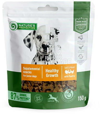 Nature's Protection Snacks Healthy Growth Puppy Poultry 150g kutyaKIEGÉSZÍTŐ CSONT ALAKÚ BAROMFI JUTALOMFALATA kölyökkutyák egészséges növekedéséhez és megfelelő fejlődéséhez, 4-12 hónapos kortól - Kiegyensúlyozott összetétel, a növekvő kutyák csontozatának, ízületeinek és immunrendszerének egészséges fejlődéséért. - A jutalomfalat baromfihúst tartalmaz, amely