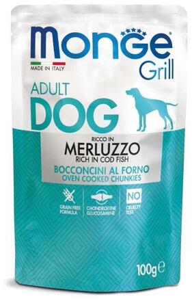 MONGE GRILL zseb tőkehallal kutyáknak 100 g, teljes értékű eledel felnőtt kutyáknak sült tőkehallal ízletes gabona nélküli recept glükozaminnal és kondroitinnal dúsítva az ízületek támogatására hozzáadott színezékek és tartósítószerek nélkül összetevők: hús és állati melléktermékek, hal és hal melléktermékek 25% (tőkehal 14%), ásványi anyagok, glükózami