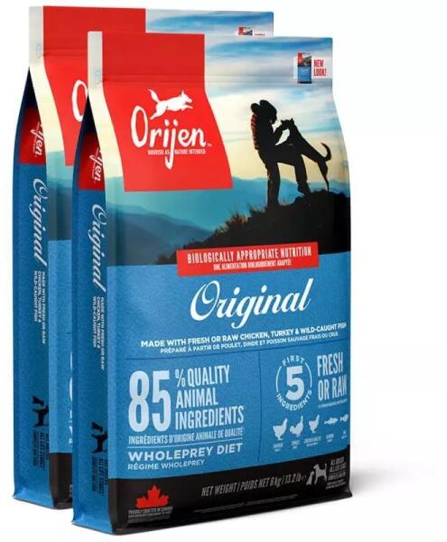 Orijen Original száraz kutyatáp Gabonamentes, fehérjékben és tápanyagokban gazdag prémium-eledel bármely fajtájú felnőtt kutyának friss kanadai alapanyagokból; 85% hal-, tojás és hús részaránnyal, 15% zöldség- és gyümölcstartalommal. Az Orijen Original szárazeledel receptúrája a WHOLEPREY-elvet követi, amely kutyusa természetes tápanyagszükségletét veszi alapul. A k