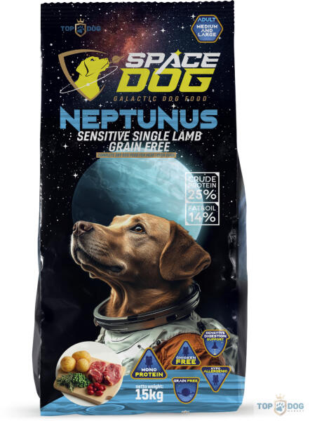 Space Dog Neptunus Sensitive Single Bárány Gabonamentes 15 kg Teljesértékű eledel felnőtt (csirke-, és szárnyas fehérje allergiás) kutyák részére Szemcseméret: 18mm / Medium&Large - Mono Protein - Ideális választás ételallergiás vagy érzékeny emésztésű kutyák számára, mivel egyetlen fehérjeforrást tartalmaz, ezáltal könnyebben emészthető és segít az allergén