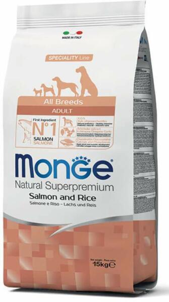 Kutya eledel MONGE Dog Salmon and rice Teljes értékű szuperprémium állateledel lazaccal és rizzsel minden méretű felnőtt kutyák napi etetésére. Ügyeljen arra, hogy bőséges tiszta ivóvíz mindig álljon rendelkezésre az állat számára. A termék első használatánál fokozatosan vezesse be az étrendbe legalább 1 hét alatt. A terméket nedvesen vagy szárazon is adagolhatjuk.