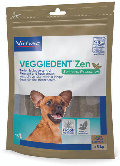 VEGGIEDENT ® ZEN Multifunkcionális fogászati rágó, amelyet olyan kutyák számára terveztek, akiknek napi támogatásra van szükségük a hatékony fogápoláshoz és a stresszoldáshoz. L-teanint tartalmaz, egy zöld teában található aminosavat, amely enyhíti a stresszreakciókat, javítja a tanulási képességet és nyugtató hatású. A VeggieDent rágókák innovatív Z alakúak,