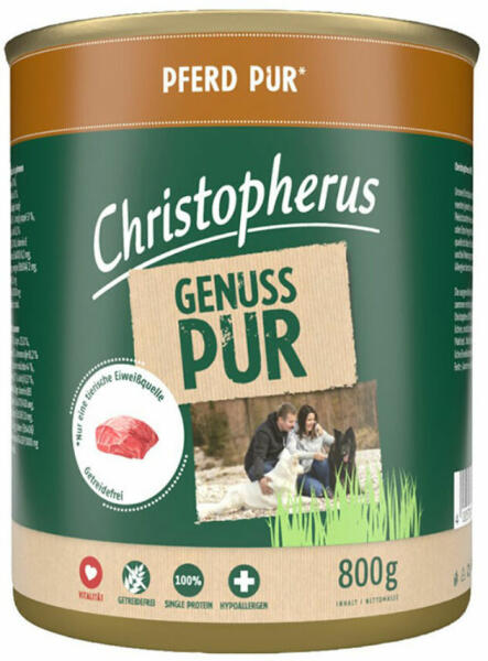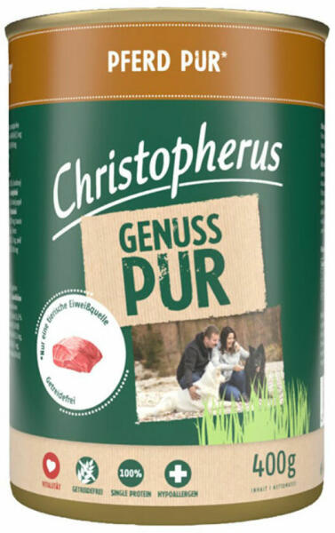 Christopherus Dog Konzerv Pure Ló 400g - Nedves Eledel Felnőtt Kutyáknak A Christopherus Dog Konzerv Pure Ló egy teljes értékű nedves eledel felnőtt kutyáknak , amely kifejezetten a kutyája igényeihez lett kialakítva. A 70%-os lóhús és belsőségek gazdag fehérjében, és könnyen emészthető, ideális táplálékot biztosít minden felnőtt kutya számára. Összetétel: Hús és