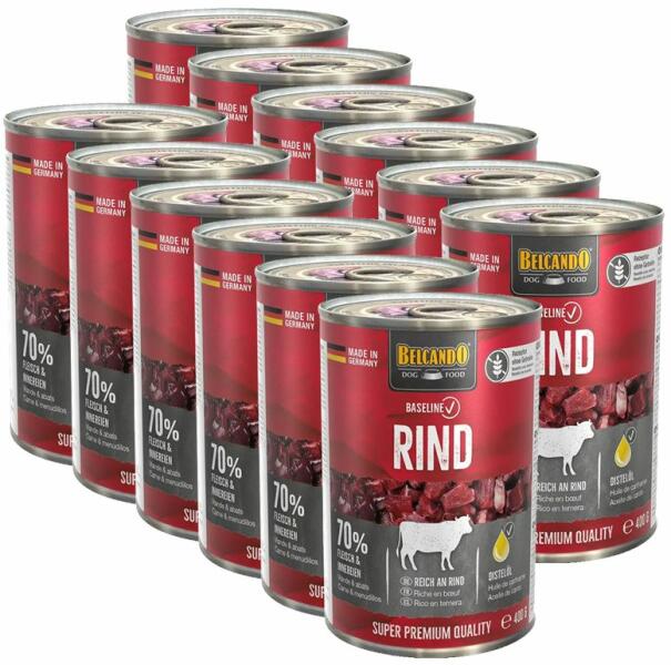 Kiegyensúlyozott nedves eledel Belcando Baseline Beef felnőtt, normál aktivitású kutyáknak Felnőtt kutyák számára 1 éves kortól normális aktivitású kutyák számára 70% hús és belsőség sáfránymagolajjal tiszta húskonzerv zöldség nélkül összetevő k: Marhahús izom, tüdő, szív, lép, tőgy (26%); Húsleves (28,8%); Hús; Máj; Gyomor; Szív; Szív; Vese; Tüdő; Tojá