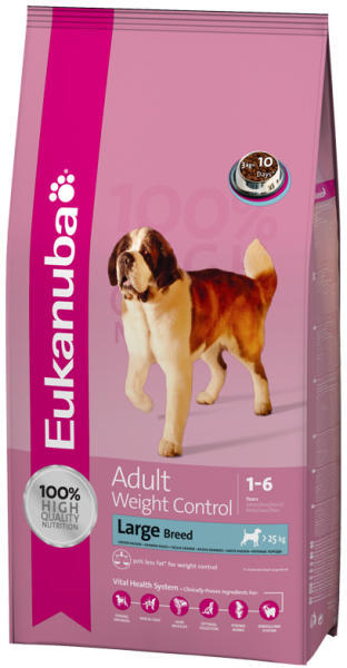 A Eukanuba Adult Weight Control Large Breed teljes értékű, kiegyensúlyozott száraztáp felnőtt (1-6 év), nagy- és óriás testű (25 kg felett), túlsúlyos , illetve kevésbé aktív kutyáknak az i deális testsúly eléréséhez . A Eukanuba Weight Control Medium Breed csökkentett zsírtartalma mellett is biztosítja a szükséges napi fehérje-, szénhidrát, vitamin- és ásványiany
