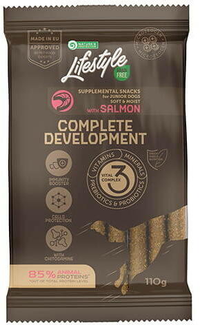 Nature's Protection Lifestyle Snacks Complete Development Puppy 110g kutya KIEGÉSZÍTŐ LAZACOS SNACK, KÁPOSZTÁS SNACK FORMÁJÁBANA kölyökkutyák egészséges növekedéséhez és megfelelő fejlődéséhez, 4-12 hónapos kortól - Kiegyensúlyozott összetétel a növekvő kutyák optimális fejlődésének támogatására. - A fő és könnyen emészthető fehérjeforrás a minősített, k