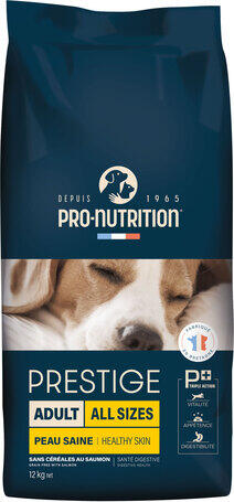 12kg A Pro-Nutirtion Prestige Adult All Size Healthy Grain Free Skin Salmon (Korábban: Flatazor Prestige Adult Sensible with Salmon) érzékeny felnőtt kutyáknak készül, lazaccal, gabonafélék nélkül. Teljes értékű eledel csirkehúsra és/vagy gabonafélékre érzékeny kutyák részére. Hipoallergén recept, könnyen emészthető összetevőkkel, mint amilyen a lazac, a burgonyakemén