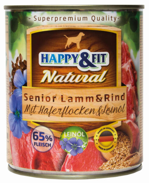 Fedezze fel a Happy & Fit Natural Dog Senior Kutyatáp Konzerv Bárány-Marha Zabliszttel és Lenmagolajjal 800g prémium eledelt, amely kifejezetten idősebb kutyák számára készült, hogy biztosítsa számukra a legjobb táplálkozást és egészséget. Ez a gazdag összetevőkkel rendelkező nedves táp ízletes bárány- és marhahússal, tápláló zabpehellyel és jótékony lenmagola