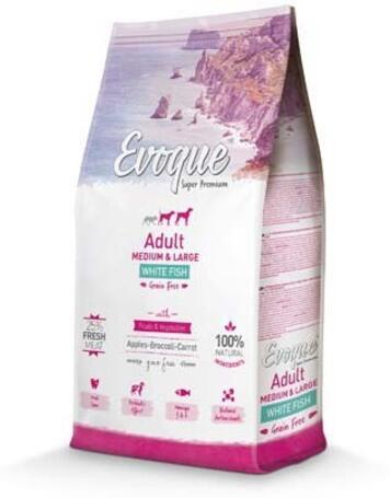 24kg Visán Evoque Dog Adult Medium/Large White Fish with Fruits & Vegetables Grain Free (26/14,7) teljes értékű gabonamentes eledel fehér hallal közepes (12 hónapos kortól) és nagytestű (18 hónapos kortól) felnőtt kutyák számára.